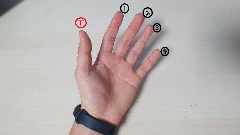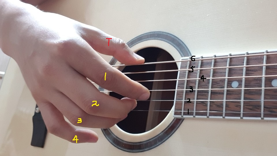 손가락 넘버링에 대한 설명은 이전에 포스팅했던 통기타 C코드 연습하기. 에서 했었지만, 처음으로 주법을 연습해보는 만큼, 다시 한번 사진을 준비해봤습니다. 왼손의 엄지는 코드를 잡을 때 소리 나면 안되는 기타줄에 살짝 얹어주어 뮤트 시켜주는 역할을 했습니다. 그리고 나머지 1번 2번 3번 4번 손가락은 코드마다 필요로 하는 포인트에 운지하곤 했습니다. 이 넘버링은 왼손 뿐만아니라 오른손에서도 같은 넘버링을 적용시켜 오른손에 대한 설명을 해보도록 하겠으니 참고해주시기 바랍니다.